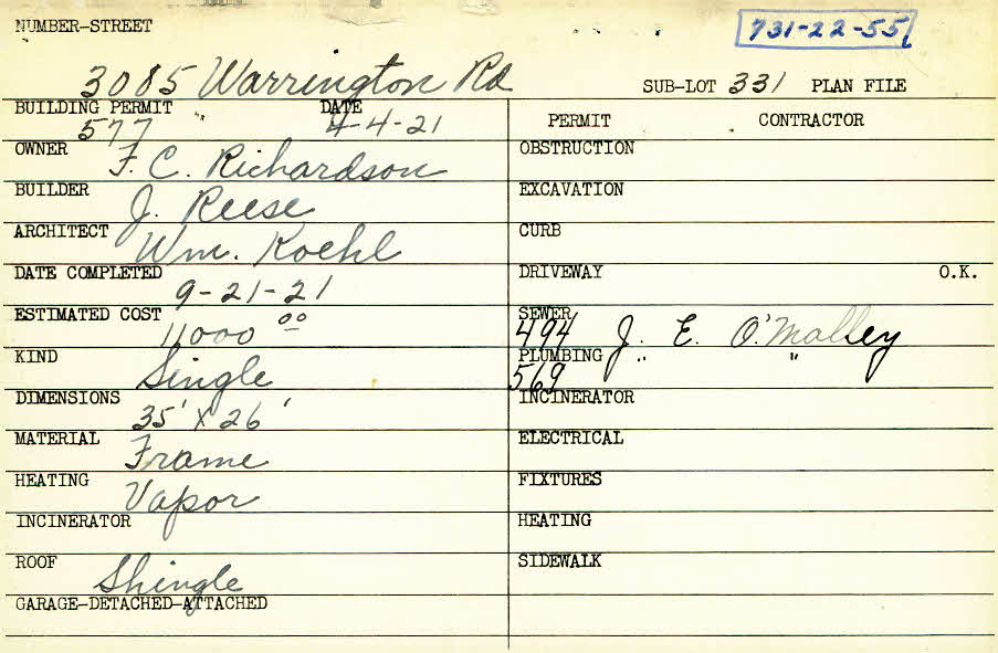 3085 Warrington Road Shaker Heights, OH 44120 PARCEL ID: 731-22-055 Building Permit Date: 04-04-1921 Neighborhood: Onaway Owner: Richardson, F. C. Builder: Reese, J. Architect: Koehl, William Estimated Cost: 11000 Date Completed: 09-21-1921 Kind: Single, Single Residence or Dwelling Material: Frame Heating: Vapor Roof: Shingles Blueprints: no blueprints on microfilm |