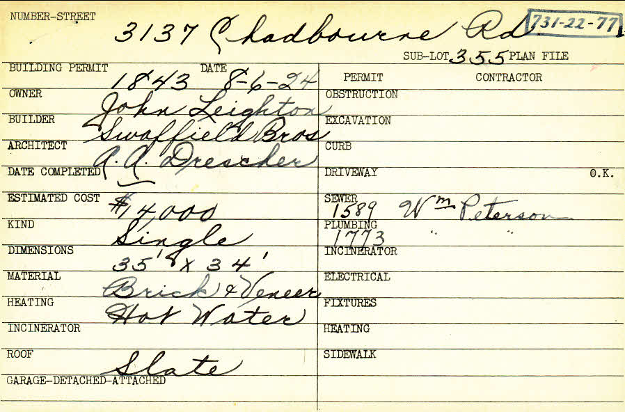 3137 Chadbourne Road Shaker Heights, OH 44120 PARCEL ID: 731-22-077 Building Permit Date: 08-06-1924 Plan File Number: 10597, 12739 Microfilm Roll: NewRoll#4, NewRoll#14 Neighborhood: Onaway Owner: Leighton, John Builder: Swaffield Brothers Architect: Drescher, A. A. Estimated Cost: 14000 Kind: Single, Single Residence or Dwelling Material: Brick and Veneer Heating: Hot Water Roof: Slate |
