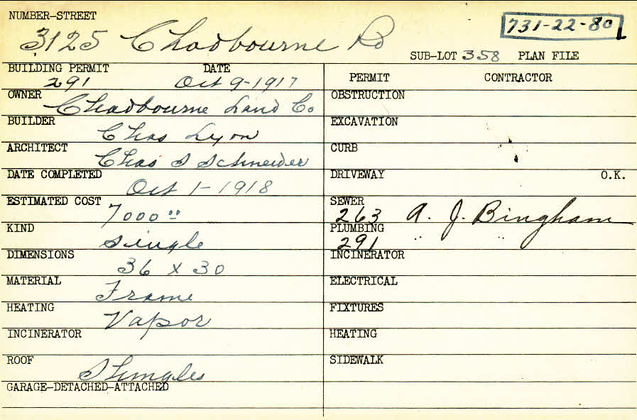 3125 Chadbourne Road Shaker Heights, OH 44120 PARCEL ID: 731-22-080 Building Permit Date: 10-09-1917 Plan File Number: 10083 Microfilm Roll: Roll#106 Neighborhood: Onaway Owner: Chadbourne Land Company Builder: Lyon, Charles Architect: Schneider, Charles S. Estimated Cost: 7000 Date Completed: 10-01-1918 Kind: Single, Single Residence or Dwelling Material: Frame Heating: Vapor Roof: Shingles |