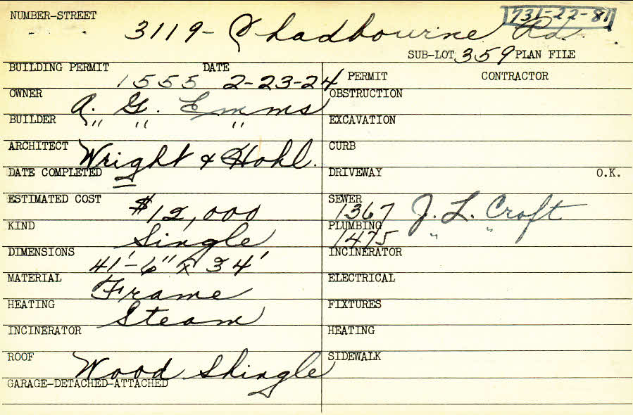 3119 Chadbourne Road Shaker Heights, OH 44120 PARCEL ID: 731-22-081 Building Permit Date: 02-23-1924 Plan File Number: 6397 Microfilm Roll: Roll#85 Owner: Emms, A. G. Builder: Emms, A. G. Architect: Robert M. Wright and Russell L. Hohl Estimated Cost: 12000 Kind: Single, Single Residence or Dwelling Material: Frame Heating: Steam Roof: Wood Shingle |
