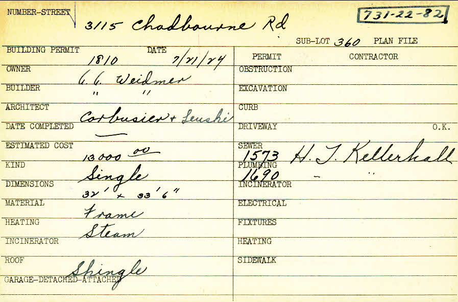 3115 Chadbourne Road Shaker Heights, OH 44120 PARCEL ID: 731-22-082 Building Permit Date: 07-21-1924 Plan File Number: 7500 Microfilm Roll: Roll#93 Neighborhood: Onaway Owner: Weidmer, A. A. Builder: Weidmer, A. A. Architect: Corbusier and Leushi Estimated Cost: 13000 Kind: Single, Single Residence or Dwelling Material: Frame Heating: Steam Roof: Shingles |