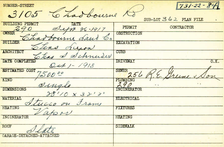 3105 Chadbourne Road Shaker Heights, OH 44120 PARCEL ID: 731-22-084 Building Permit Date: 09-26-1917 Plan File Number: 0 Neighborhood: Onaway Owner: Chadbourne Land Company Builder: Lyon, Clens Architect: Schneider, Charles S. Estimated Cost: 7500 Date Completed: 10-01-1918 Kind: Single, Single Residence or Dwelling Material: Stucco on Frame Heating: Vapor Roof: Slate |
