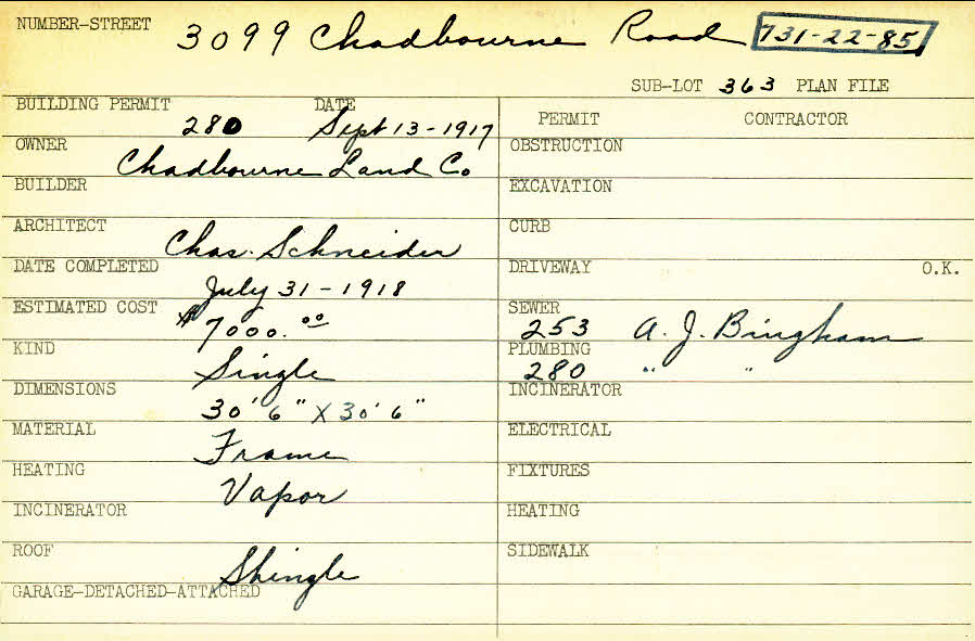 3099 Chadbourne Road Shaker Heights, OH 44120 PARCEL ID: 731-22-085 Building Permit Date: 09-13-1917 Plan File Number: 0 Neighborhood: Onaway Owner: Chadbourne Land Company Architect: Schneider, Charles Estimated Cost: 7000 Date Completed: 07-31-1918 Kind: Single, Single Residence or Dwelling Material: Frame Heating: Vapor Roof: Shingles |