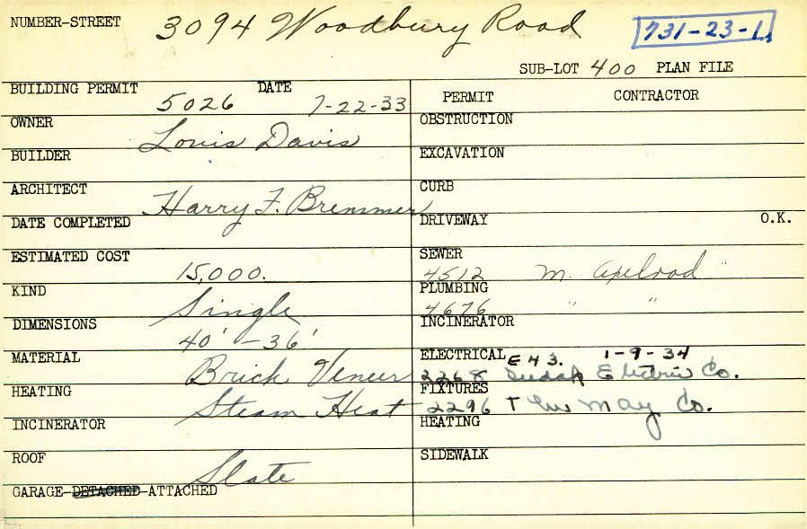 3094 Woodbury Road Shaker Heights, OH 44120 PARCEL ID: 731-23-001 Building Permit Date: 07-22-1933 Plan File Number: 0 Neighborhood: Onaway Owner: Davis, Louis Architect: Bremmer, Harry F. Estimated Cost: 15000 Kind: Single, Single Residence or Dwelling Material: Brick Veneer Heating: Steam Roof: Slate Garage: attached |  |