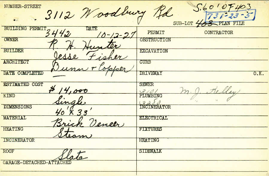 3112 Woodbury Road Shaker Heights, OH 44120 PARCEL ID: 731-23-005 Building Permit Date: 10-12-1927 Plan File Number: 12223 Microfilm Roll: NewRoll#11 Neighborhood: Onaway Owner: Hunter, R. H. Builder: Fisher, Jesse Architect: Dunn and Copper Estimated Cost: 14000 Kind: Single, Single Residence or Dwelling Material: Brick Veneer Heating: Steam Roof: Slate |
