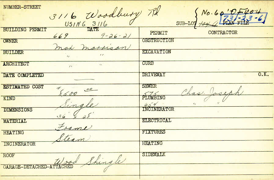 3116 Woodbury Road Shaker Heights, OH 44120 PARCEL ID: 731-23-006 Building Permit Date: 09-26-1921 Plan File Number: 0 Neighborhood: Onaway Owner: Morrison, Max Builder: Morrison, Max Architect: Morrison, Max Estimated Cost: 8500 Kind: Single, Single Residence or Dwelling Material: Frame Heating: Steam Roof: Wood Shingle Card Available: yes |
