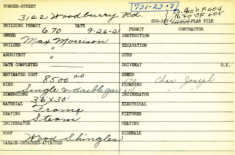 3122 Woodbury Road Shaker Heights, OH 44120 PARCEL ID: 731-23-007 Building Permit Date: 09-26-1921 Plan File Number: 0 Neighborhood: Onaway Owner: Morrison, Max Builder: Morrison, Max Architect: Morrison, Max Estimated Cost: 8500 Kind: Single Dwelling and Garage Material: Frame Heating: Steam Roof: Wood Shingle |