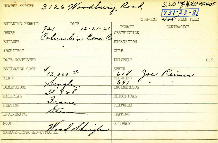 3126 Woodbury Road Shaker Heights, OH 44120 PARCEL ID: 731-23-008 Building Permit Date: 12-21-1921 Plan File Number: 0 Neighborhood: Onaway Owner: Columbia Construction Company Builder: Columbia Constructtion Company Estimated Cost: 12000 Kind: Single, Single Residence or Dwelling Material: Frame Heating: Steam Roof: Wood Shingle |