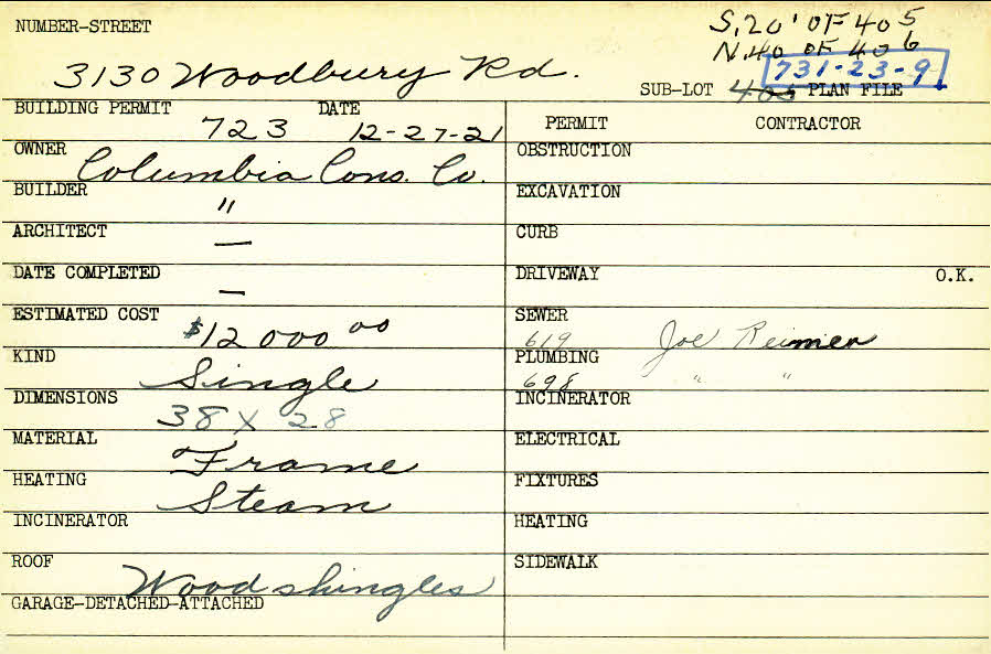 3130 Woodbury Road Shaker Heights, OH 44120 PARCEL ID: 731-23-009 Building Permit Date: 12-27-1921 Plan File Number: 0 Neighborhood: Onaway Owner: Columbia Construction Company Builder: Columbia Constructtion Company Estimated Cost: 12000 Kind: Single, Single Residence or Dwelling Material: Frame Heating: Steam Roof: Wood Shingle |