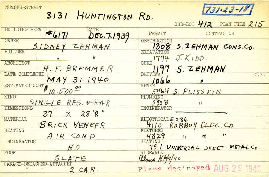 3131 Huntington Road Shaker Heights, OH 44120 PARCEL ID: 731-23-018 Building Permit Date: 12-07-1939 Neighborhood: Onaway Owner: Zehman, Sidney Builder: Zehman, Sidney Architect: Bremmer, Harry F. Estimated Cost: 10500 Date Completed: 05-31-1940 Kind: Single Dwelling and Garage Material: Brick Veneer Heating: Air Conditioned Roof: Slate Garage: detached 2 car Blueprints: no blueprints on microfilm |