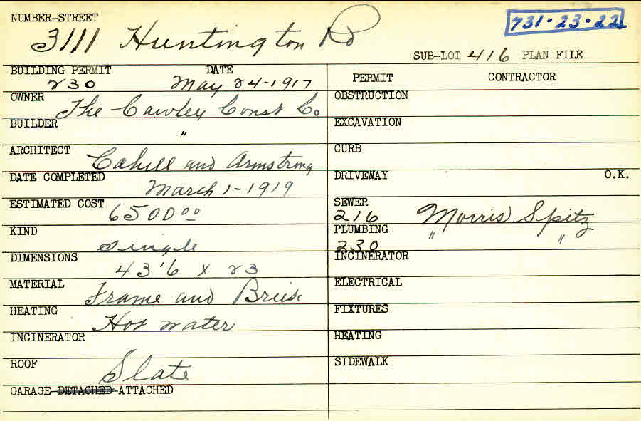 3111 Huntington Road Shaker Heights, OH 44120 PARCEL ID: 731-23-022 Building Permit Date: 05-24-1917 Plan File Number: 0 Neighborhood: Onaway Owner: The Cawley Construction Company Builder: The Cawley Construction Company Architect: Cahill and Armstrong Estimated Cost: 6500 Date Completed: 03-01-1919 Kind: Single, Single Residence or Dwelling Material: Frame and Brick Heating: Hot Water Roof: Slate Garage: attached Card Available: yes |
