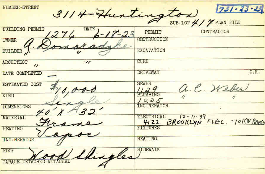 3114 Huntington Road Shaker Heights, OH 44120 PARCEL ID: 731-23-023 Building Permit Date: 06-18-1923 Neighborhood: Onaway Owner: Domaradzke, A. Builder: Domaradzke, A. Architect: Domaradzke, A. Estimated Cost: 10000 Kind: Single, Single Residence or Dwelling Material: Frame Heating: Vapor Roof: Wood Shingle Blueprints: no blueprints on microfilm |