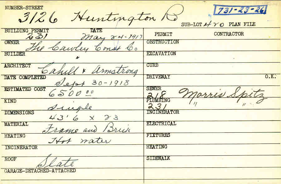 3126 Huntington Road Shaker Heights, OH 44120 PARCEL ID: 731-23-026 Building Permit Date: 05-24-1917 Plan File Number: 3442 Microfilm Roll: Roll#51 Neighborhood: Onaway Owner: The Cawley Construction Company Builder: The Cawley Construction Company Architect: Cahill and Armstrong Estimated Cost: 6500 Date Completed: 09-30-1918 Kind: Single, Single Residence or Dwelling Material: Frame and Brick Heating: Hot Water Roof: Slate |