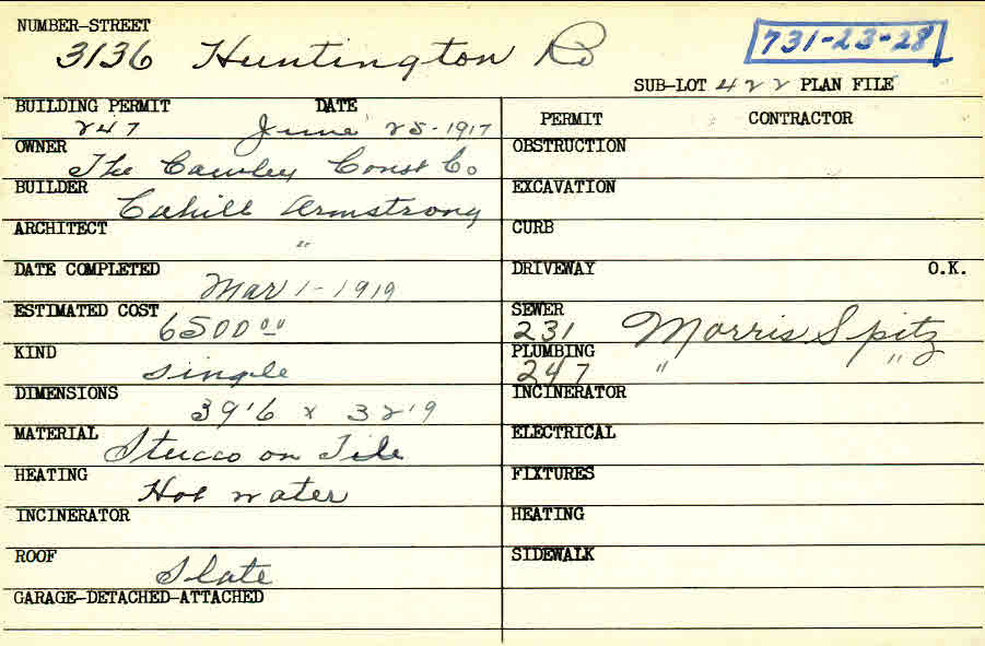 3136 Huntington Road Shaker Heights, OH 44120 PARCEL ID: 731-23-028 Building Permit Date: 06-25-1917 Plan File Number: 9806 Microfilm Roll: Roll#104 Neighborhood: Onaway Owner: The Cawley Construction Company Builder: Cahill and Armstrong Architect: Cahill and Armstrong Estimated Cost: 6500 Date Completed: 03-01-1919 Kind: Single, Single Residence or Dwelling Material: Stucco on Tile Heating: Hot Water Roof: Slate |
