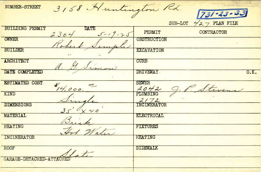 3158 Huntington Road Shaker Heights, OH 44120 PARCEL ID: 731-23-033 Building Permit Date: 05-19-1925 Plan File Number: 0 Neighborhood: Onaway Owner: Simple, Robert Builder: Simple, Robert Architect: Simon, A. G. Estimated Cost: 14000 Kind: Single, Single Residence or Dwelling Material: Brick Heating: Hot Water Roof: Slate Card Available: yes |