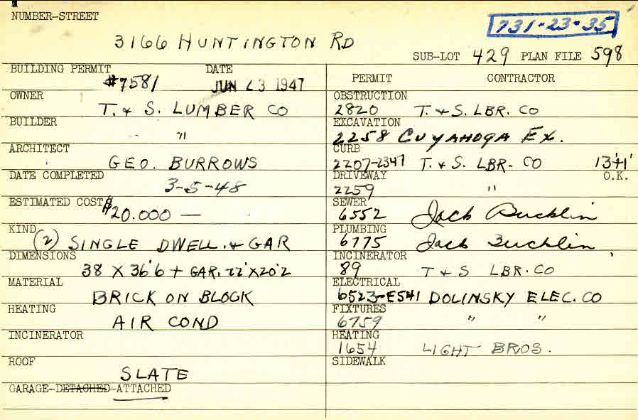 3166 Huntington Road Shaker Heights, OH 44120 PARCEL ID: 731-23-035 Building Permit Date: 06-23-1947 Plan File Number: 598 all scanned Microfilm Roll: Roll007 Neighborhood: Onaway Owner: T. and S. Lumber Company Builder: T. and S. Lumber Company Architect: Burrows, George Estimated Cost: 20000 Date Completed: 03-05-1948 Kind: Single Dwelling and Garage (2) Material: Brick on Block Heating: Air Conditioned Roof: Slate Garage: attached |