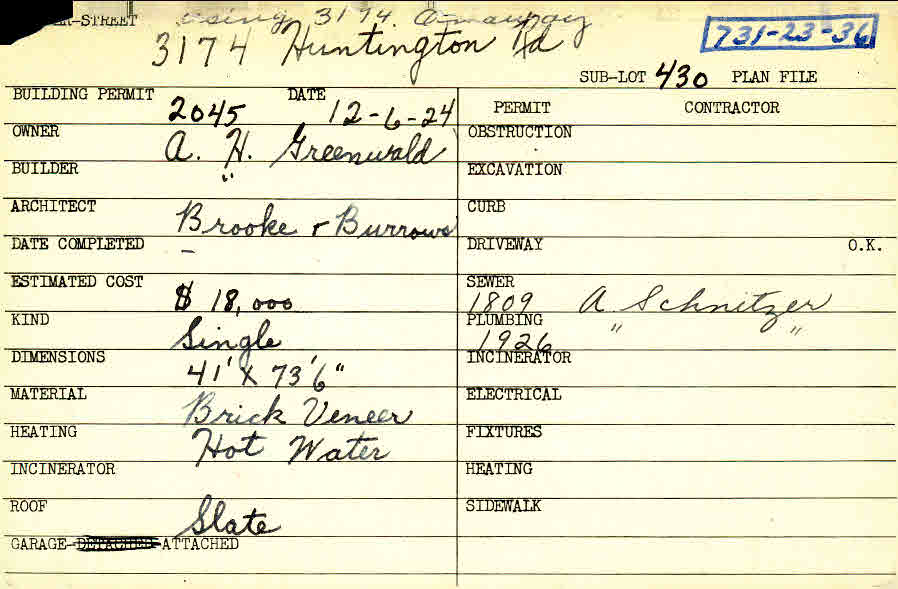 3174 Huntington Road Shaker Heights, OH 44120 PARCEL ID: 731-23-036 Building Permit Date: 12-06-1924 Plan File Number: 0 Neighborhood: Onaway Owner: Greenwald, A. H. Builder: Greenwald, A. H. Architect: Brooke and Burrows Estimated Cost: 18000 Kind: Single, Single Residence or Dwelling Material: Brick Veneer Heating: Hot Water Roof: Slate Garage: attached Card Available: yes |