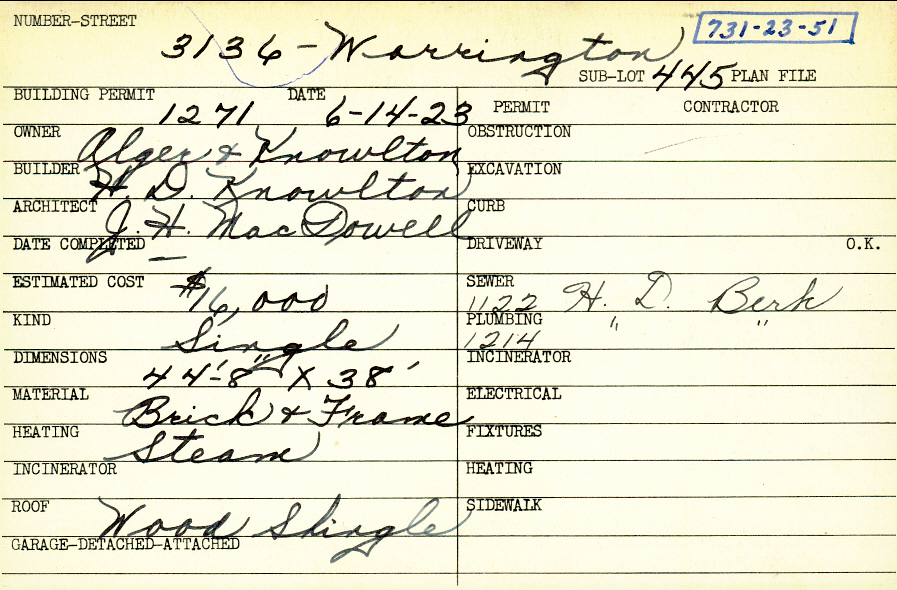 3136 Warrington Road Shaker Heights, OH 44120 PARCEL ID: 731-23-051 Building Permit Date: 06-14-1923 Plan File Number: 4550 all scanned Microfilm Roll: Roll063 Neighborhood: Onaway Owner: Alger and Knowlton Builder: Knowlton, H. D. Architect: MacDowell, J. H. Estimated Cost: 16000 Kind: Single, Single Residence or Dwelling Material: Brick and Frame Heating: Steam Roof: Wood Shingle Blueprints: online, see link above |