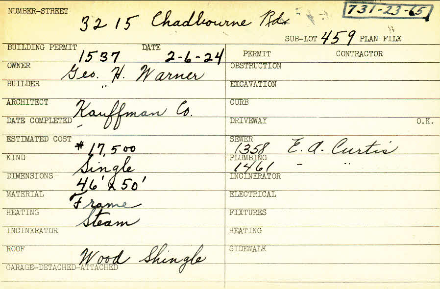 3215 Chadbourne Road Shaker Heights, OH 44120 PARCEL ID: 731-23-065 Building Permit Date: 02-06-1924 Plan File Number: 0 Neighborhood: Onaway Owner: Warner, George H. Builder: Warner, George H. Architect: Kauffman Company Estimated Cost: 17500 Kind: Single, Single Residence or Dwelling Material: Frame Heating: Steam Roof: Wood Shingle |