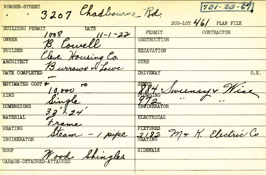 3207 Chadbourne Road Shaker Heights, OH 44120 PARCEL ID: 731-23-067 Building Permit Date: 11-01-1922 Plan File Number: 0 Neighborhood: Onaway Owner: Cowell, B. Builder: Cleveland Housing Company Architect: Burrows and Lowe Estimated Cost: 10000 Kind: Single, Single Residence or Dwelling Material: Frame Heating: Steam Roof: Wood Shingle |