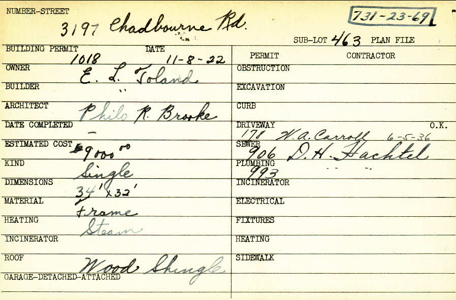 3197 Chadbourne Road Shaker Heights, OH 44120 PARCEL ID: 731-23-069 Building Permit Date: 11-08-1922 Plan File Number: 6029 Microfilm Roll: Roll#80 Neighborhood: Onaway Owner: Toland, E. L. Builder: Toland, E. L. Architect: Brooke, Philo R. Estimated Cost: 9000 Kind: Single, Single Residence or Dwelling Material: Frame Heating: Steam Roof: Wood Shingle |