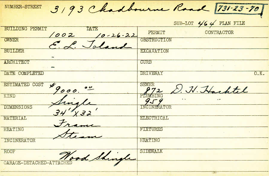 3193 Chadbourne Road Shaker Heights, OH 44120 PARCEL ID: 731-23-070 Building Permit Date: 10-26-1922 Plan File Number: 0 Neighborhood: Onaway Owner: Toland, E. L. Builder: Toland, E. L. Architect: Toland, E. L. Estimated Cost: 9000 Kind: Single, Single Residence or Dwelling Material: Frame Heating: Steam Roof: Wood Shingle |