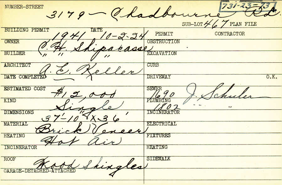 3179 Chadbourne Road Shaker Heights, OH 44120 PARCEL ID: 731-23-073 Building Permit Date: 10-02-1924 Plan File Number: 0 Owner: Shipacasse, C. H. Builder: Shipacasse, C. H. Architect: Keller, Arthur Emil Estimated Cost: 12000 Kind: Single, Single Residence or Dwelling Material: Brick Veneer Heating: Hot Air Roof: Wood Shingle |
