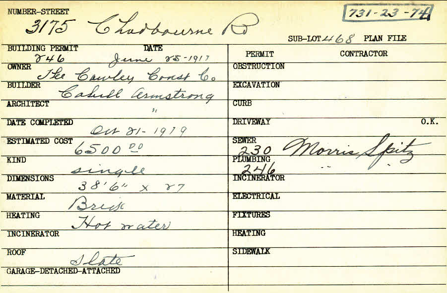 3175 Chadbourne Road Shaker Heights, OH 44120 PARCEL ID: 731-23-074 Building Permit Date: 06-25-1917 Plan File Number: 0 Owner: The Cawley Construction Company Builder: Cahill and Armstrong Architect: Cahill and Armstrong Estimated Cost: 6500 Date Completed: 10-21-1919 Kind: Single, Single Residence or Dwelling Material: Brick Heating: Hot Water Roof: Slate |