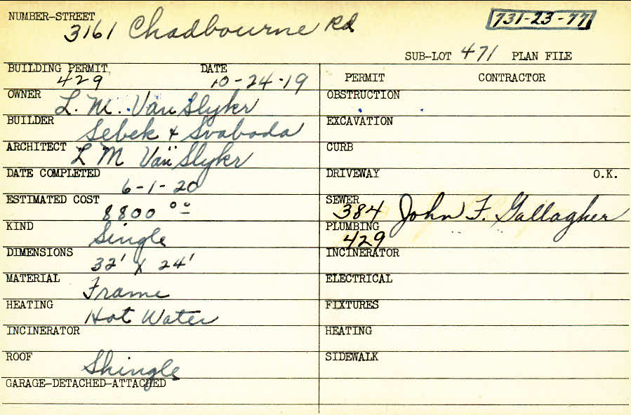 3161 Chadbourne Road Shaker Heights, OH 44120 PARCEL ID: 731-23-077 Building Permit Date: 10-24-1919 Plan File Number: 0 Neighborhood: Onaway Owner: VanSlyker, L. M. Builder: Sebek and Svaboda Architect: VanSlyker, L. M. Estimated Cost: 8800 Date Completed: 06-01-1920 Kind: Single, Single Residence or Dwelling Material: Frame Heating: Hot Water Roof: Shingles |