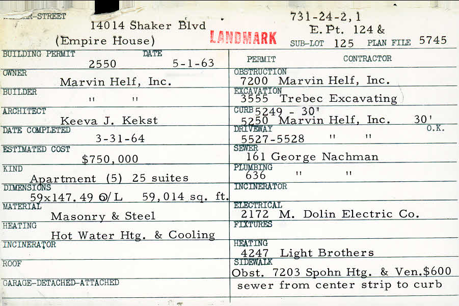 14014 Shaker Boulevard Shaker Heights, OH 44120 PARCEL ID: 731-24-001 Building Permit Date: 05-01-1963 Plan File Number: 5745 Microfilm Roll: Roll#77 Neighborhood: Boulevard Owner: Marvin Helf, Inc. Builder: Marvin Helf, Inc. Architect: Kekst, Keeva J. Estimated Cost: 750000 Date Completed: 03-31-1964 Kind: Apartment or Multi-family (3+) Material: Masonry and Steel Heating: Hot Water |