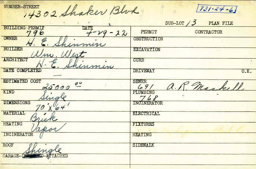 14302 Shaker Boulevard Shaker Heights, OH 44120 PARCEL ID: 731-24-006 Building Permit Date: 04-29-1922 Plan File Number: 10120 Microfilm Roll: NewRoll#2 Neighborhood: Boulevard Owner: Shinmin, H. E. Builder: West, William Architect: Shinmin, H. E. Estimated Cost: 25000 Kind: Single, Single Residence or Dwelling Material: Brick Heating: Vapor Roof: Shingles Garage: attached |