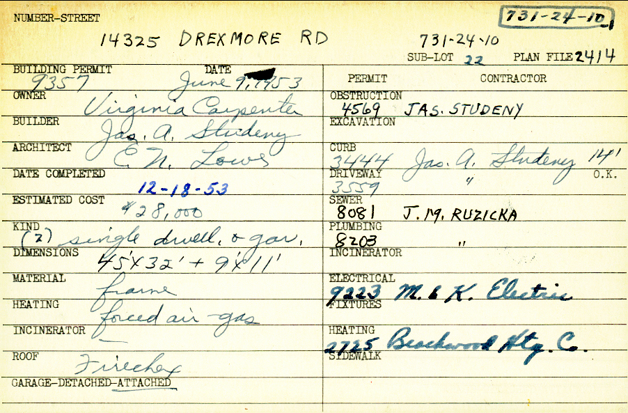 14325 Drexmore Road Shaker Heights, OH 44120 PARCEL ID: 731-24-010 Building Permit Date: 06-09-1953 Plan File Number: 2414 all scanned Microfilm Roll: Roll035 Neighborhood: Boulevard Owner: Carpenter, Virginia Builder: Studney, James A. Architect: Lowe, C. N. Estimated Cost: 28000 Date Completed: 12-18-1953 Kind: Single Dwelling and Garage (2) Material: Frame Heating: Forced Air - Gas Roof: Asphalt Garage: attached |