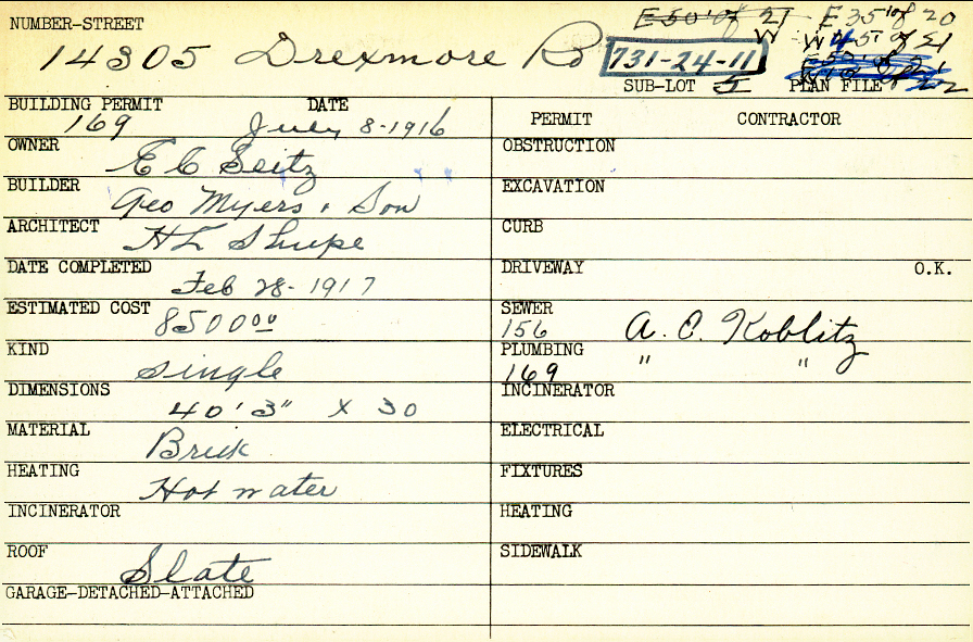 14305 Drexmore Road Shaker Heights, OH 44120 PARCEL ID: 731-24-011 Building Permit Date: 07-08-1916 Plan File Number: 0 Neighborhood: Boulevard Owner: Seitz, E. C. Builder: George Myers and Son Architect: Shupe, H. L. Estimated Cost: 8500 Date Completed: 02-28-1917 Kind: Single, Single Residence or Dwelling Material: Brick Heating: Hot Water Roof: Slate Card Available: yes |