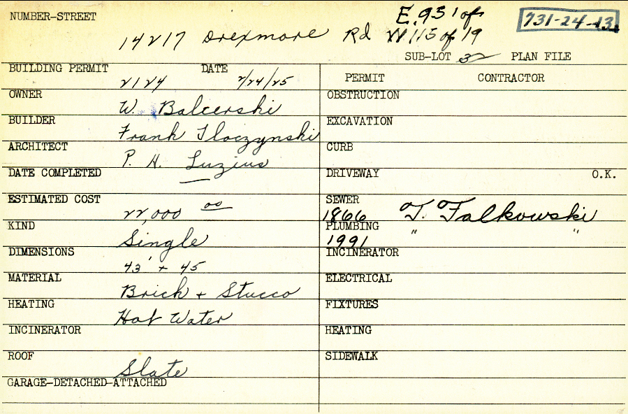 14217 Drexmore Road Shaker Heights, OH 44120 PARCEL ID: 731-24-013 Building Permit Date: 02-24-1925 Plan File Number: 4261 all scanned Microfilm Roll: Roll062 Neighborhood: Boulevard Owner: Balcerski, W. Builder: Tloczynski, Frank Architect: Luzius, P. H. Estimated Cost: 22000 Kind: Single, Single Residence or Dwelling Material: Brick and Stucco Heating: Hot Water Roof: Slate |