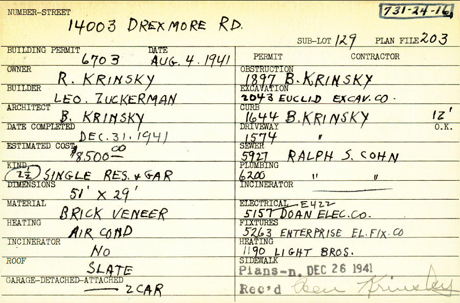 14003 Drexmore Road Shaker Heights, OH 44120 PARCEL ID: 731-24-016 Building Permit Date: 08-04-1941 Neighborhood: Boulevard Owner: Krinsky, R. Builder: Zuckerman, Leo Architect: Krinsky, B. Estimated Cost: 8500 Date Completed: 12-31-1941 Kind: Single 2-1/2 Material: Brick Veneer Heating: Air Conditioned Roof: Slate Garage: attached 2 car Blueprints: no blueprints on microfilm |