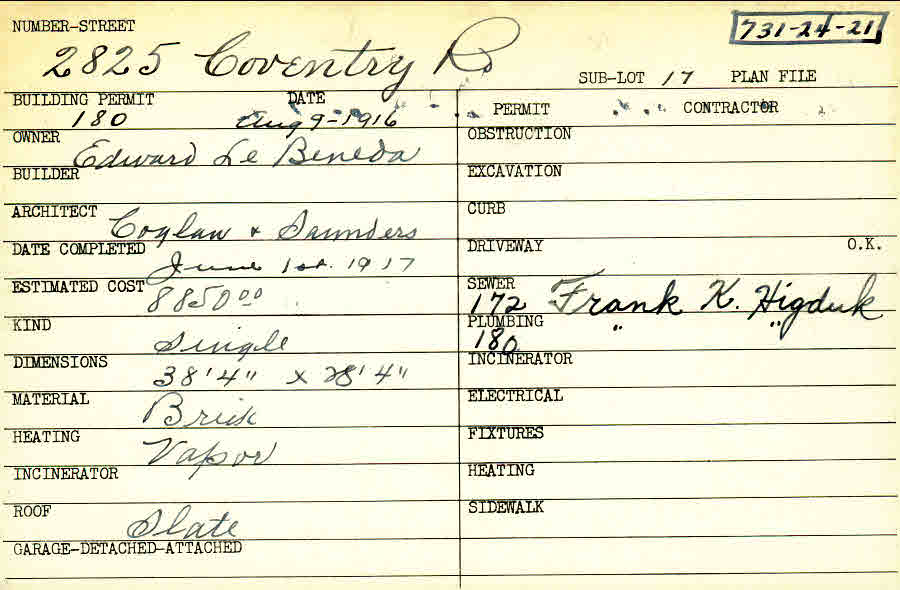 2825 Coventry Road Shaker Heights, OH 44120 PARCEL ID: 731-24-021 Building Permit Date: 08-09-1916 Plan File Number: 5749 all scanned Microfilm Roll: Roll078 Owner: Le Beneda, Edward Architect: Coylaw and Saunders Estimated Cost: 8850 Date Completed: 06-01-1917 Kind: Single, Single Residence or Dwelling Material: Brick Heating: Vapor Roof: Slate |