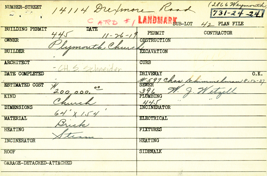 14114 Drexmore Road Shaker Heights, OH 44120 PARCEL ID: 731-24-024 Building Permit Date: 11-26-1919 Plan File Number: 75, 6066 all scanned Microfilm Roll: Roll001, Roll081 Neighborhood: Boulevard Owner: Plymouth Church Architect: Schneider, Charles S. Estimated Cost: 200000 Material: Brick Heating: Steam |