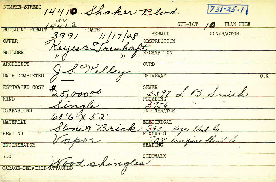 14410 Shaker Boulevard Shaker Heights, OH 44120 PARCEL ID: 731-25-001 Pictured in Keyes-Treuhaft's Distinctive Dwellings, p. 6 and Distinctive Dwellings, p. 7 Building Permit Date: 11-17-1928 Owner: Keyes and Treuhaft Builder: Keyes and Treuhaft Architect: Kelly, John Sherwood Estimated Cost: 25000 Kind: Single, Single Residence or Dwelling Material: Stone and Brick Heating: Vapor Roof: Wood Shingle Blueprints: no blueprints on microfilm |