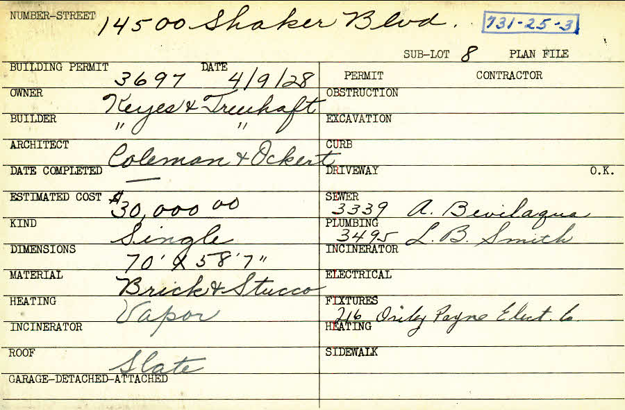 14500 Shaker Boulevard Shaker Heights, OH 44120 PARCEL ID: 731-25-003 Pictured in Keyes-Treuhaft's Distinctive Dwellings, p. 3 Building Permit Date: 04-09-1928 Owner: Keyes and Treuhaft Builder: Keyes and Treuhaft Architect: Coleman, Charles C. and Ockert, Paul Estimated Cost: 30000 Kind: Single, Single Residence or Dwelling Material: Brick and Stucco Heating: Vapor Roof: Slate Blueprints: no blueprints on microfilm |