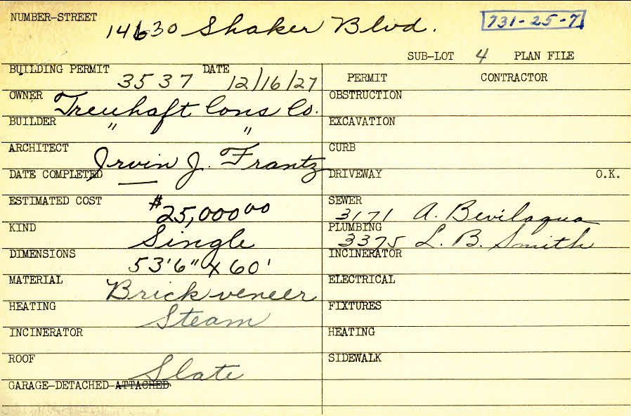 14630 Shaker Boulevard Shaker Heights, OH 44120 PARCEL ID: 731-25-007 Pictured in Keyes-Treuhaft's Distinctive Dwellings, p. 17 Building Permit Date: 12-16-1927 Neighborhood: Boulevard Owner: Treuhaft Construction Company Builder: Treuhaft Construction Company Architect: Frantz, Irvin J. Estimated Cost: 25000 Kind: Single, Single Residence or Dwelling Material: Brick Veneer Heating: Steam Roof: Slate Garage: detached Blueprints: no blueprints on microfilm |