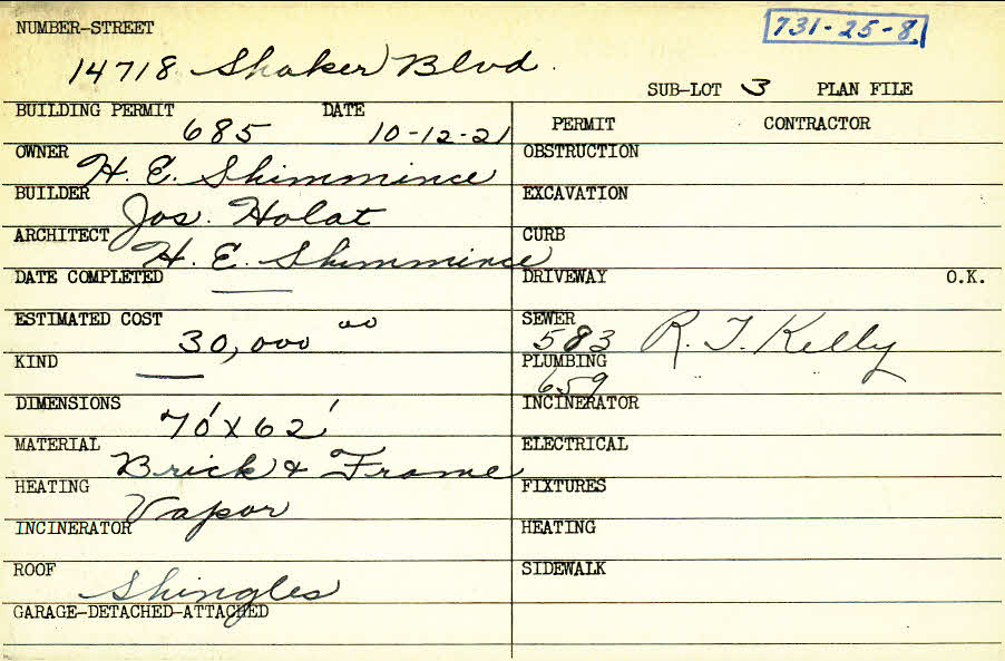 14718 Shaker Boulevard Shaker Heights, OH 44120 PARCEL ID: 731-25-008 Building Permit Date: 10-12-1921 Plan File Number: 0 Owner: Shimmin, H. E. Builder: Holat, Joseph Architect: Shimmin, H. E. Estimated Cost: 30000 Material: Brick and Frame Heating: Vapor Roof: Shingles |