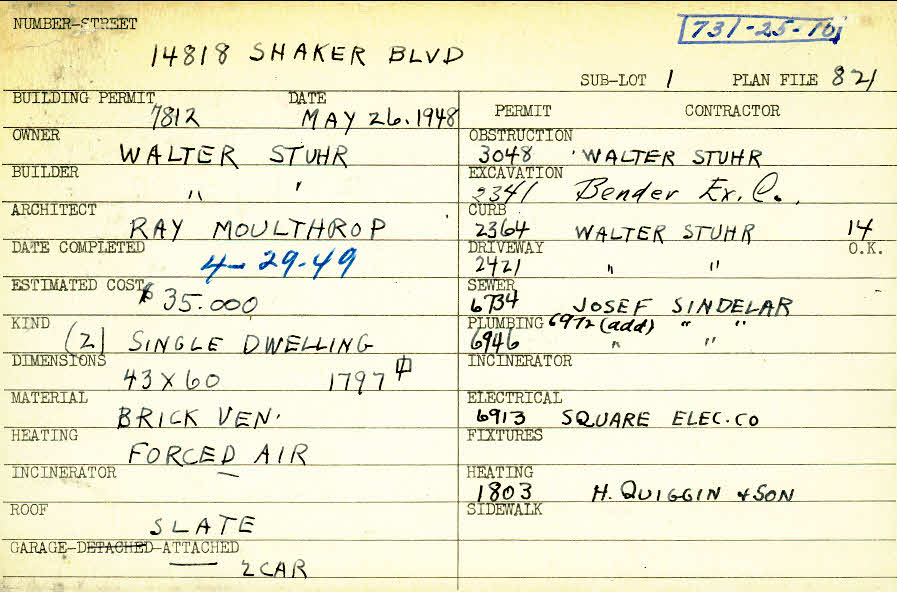 14818 Shaker Boulevard Shaker Heights, OH 44120 PARCEL ID: 731-25-010 Building Permit Date: 05-26-1948 Plan File Number: 821 all scanned Microfilm Roll: Roll011 Neighborhood: Boulevard Owner: Stuhr, Walter Builder: Stuhr, Walter Architect: Moulthrop, Ray Estimated Cost: 35000 Date Completed: 04-29-1949 Kind: Single, Single Residence or Dwelling (2) Material: Brick Veneer Heating: Forced Air Roof: Slate Garage: attached 2 car |