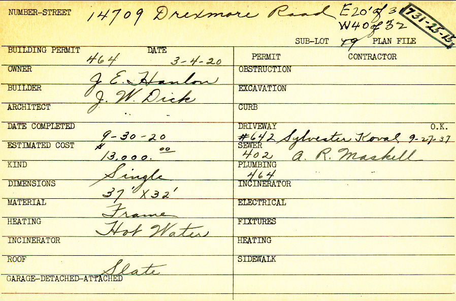 14709 Drexmore Road Shaker Heights, OH 44120 PARCEL ID: 731-25-015 Building Permit Date: 03-04-1920 Plan File Number: 0 Neighborhood: Boulevard Owner: Hanlon, J. E. Builder: Dick, J. W. Architect: Dick, J. W. Estimated Cost: 13000 Date Completed: 09-30-1920 Kind: Single, Single Residence or Dwelling Material: Frame Heating: Hot Water Roof: Slate Card Available: yes |