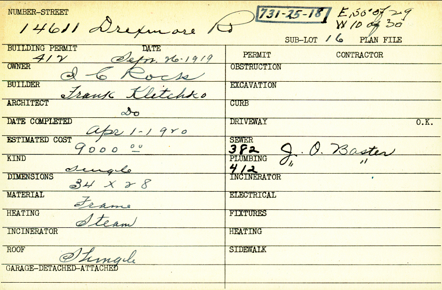 14611 Drexmore Road Shaker Heights, OH 44120 PARCEL ID: 731-25-018 Building Permit Date: 09-26-1919 Plan File Number: 5597 Microfilm Roll: Roll#76 Neighborhood: Boulevard Owner: Rock, I. C. Builder: Klitchko, Frank Architect: Klitchko, Frank Estimated Cost: 9000 Date Completed: 04-01-1920 Kind: Single, Single Residence or Dwelling Material: Frame Heating: Steam Roof: Shingles |