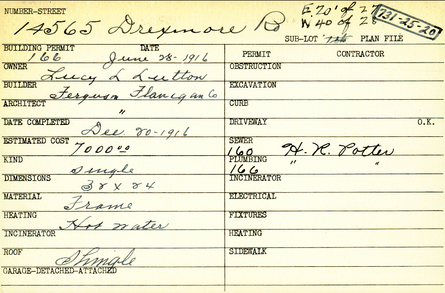 14565 Drexmore Road Shaker Heights, OH 44120 PARCEL ID: 731-25-020 Building Permit Date: 06-28-1916 Plan File Number: 0 Neighborhood: Boulevard Owner: Lutton, Lucy L. Builder: Ferguson and Flanigan Company Architect: Ferguson and Flanigan Company Estimated Cost: 7000 Date Completed: 12-20-1916 Kind: Single, Single Residence or Dwelling Material: Frame Heating: Hot Water Roof: Shingles Card Available: yes |