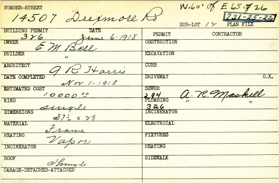 14507 Drexmore Road Shaker Heights, OH 44120 PARCEL ID: 731-25-022 Building Permit Date: 06-06-1918 Plan File Number: 0 Neighborhood: Boulevard Owner: Bell, E. M. Builder: Bell, E. M. Architect: Harris, A. R. Estimated Cost: 10000 Date Completed: 11-01-1918 Kind: Single, Single Residence or Dwelling Material: Frame Heating: Vapor Roof: Shingles |