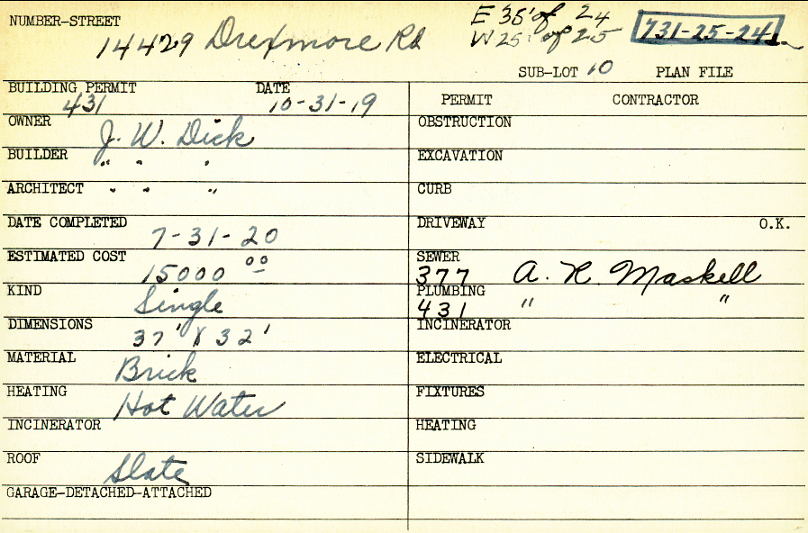 14429 Drexmore Road Shaker Heights, OH 44120 PARCEL ID: 731-25-024 Building Permit Date: 10-31-1919 Plan File Number: 0 Neighborhood: Boulevard Owner: Dick, J. W. Builder: Dick, J. W. Architect: Dick, J. W. Estimated Cost: 15000 Date Completed: 07-31-1920 Kind: Single, Single Residence or Dwelling Material: Brick Heating: Hot Water Roof: Slate Card Available: yes |