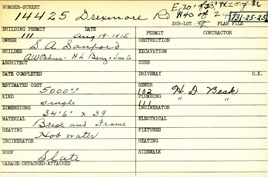 14425 Drexmore Road Shaker Heights, OH 44120 PARCEL ID: 731-25-025 Building Permit Date: 08-19-1915 Plan File Number: 0 Neighborhood: Boulevard Owner: Sanford, S. A. Builder: A. W. Palmer/ H. L. Bing and Sons Company Estimated Cost: 5000 Kind: Single, Single Residence or Dwelling Material: Brick and Frame Heating: Hot Water Roof: Slate |