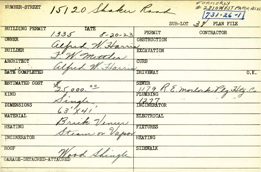 15120 Shaker Boulevard Shaker Heights, OH 44120 PARCEL ID: 731-26-001 Building Permit Date: 08-20-1923 Plan File Number: 0 Neighborhood: Boulevard Owner: Harris, Alfred W. Builder: Mittler, F. W. Architect: Harris, Alfred W. Estimated Cost: 25000 Kind: Single, Single Residence or Dwelling Material: Brick Veneer Roof: Wood Shingle |