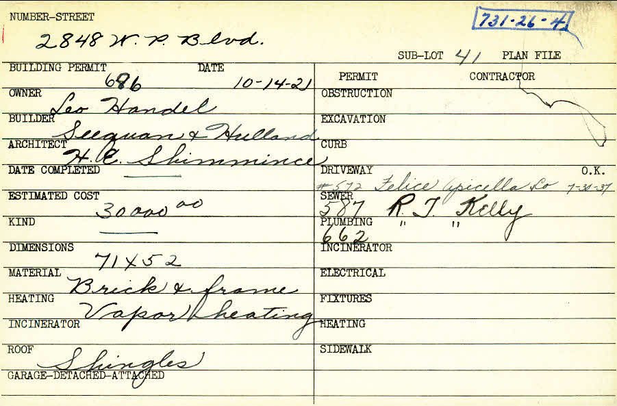 2848 West Park Boulevard Shaker Heights, OH 44120 PARCEL ID: 731-26-004 Building Permit Date: 10-14-1921 Plan File Number: 2907 scanned Microfilm Roll: Roll041 Owner: Handel, Leo Builder: Seequam and Hulland Architect: Shimmin, H. E. Estimated Cost: 30000 Material: Brick and Frame Heating: Vapor Roof: Shingles |
